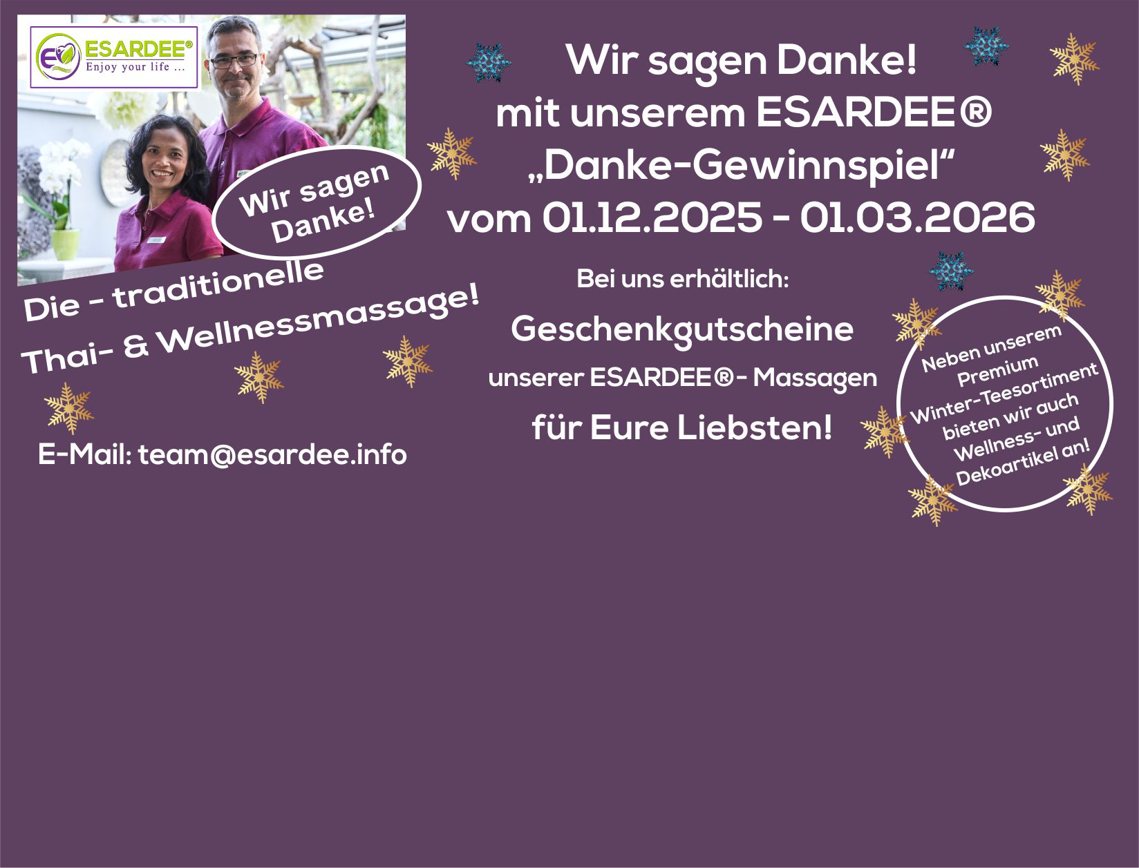 - eine ESARDEE® Massage – mobil oder in einem der Studios der ESARDEE® GbR traditionelle Thai- und Wellnessmassagen Sumittra & Roman Paprakon (Standort 53347 Alfter Holzgasse 15 oder 51570 Windeck-Leuscheid Weyerbuscher Str. 38) erhalten haben, oder